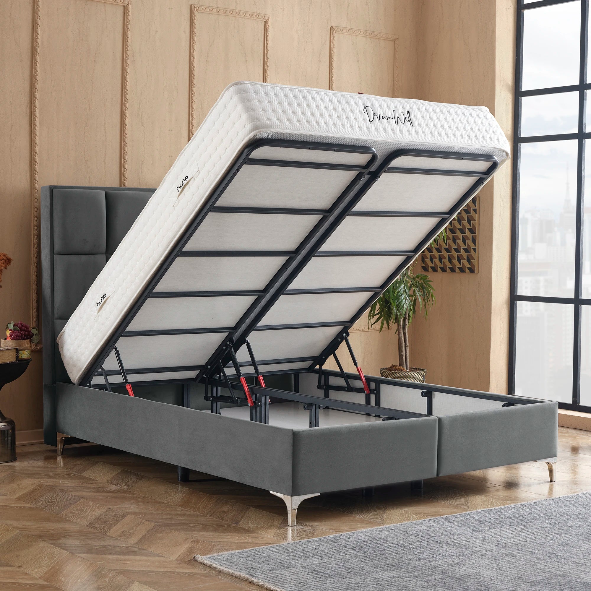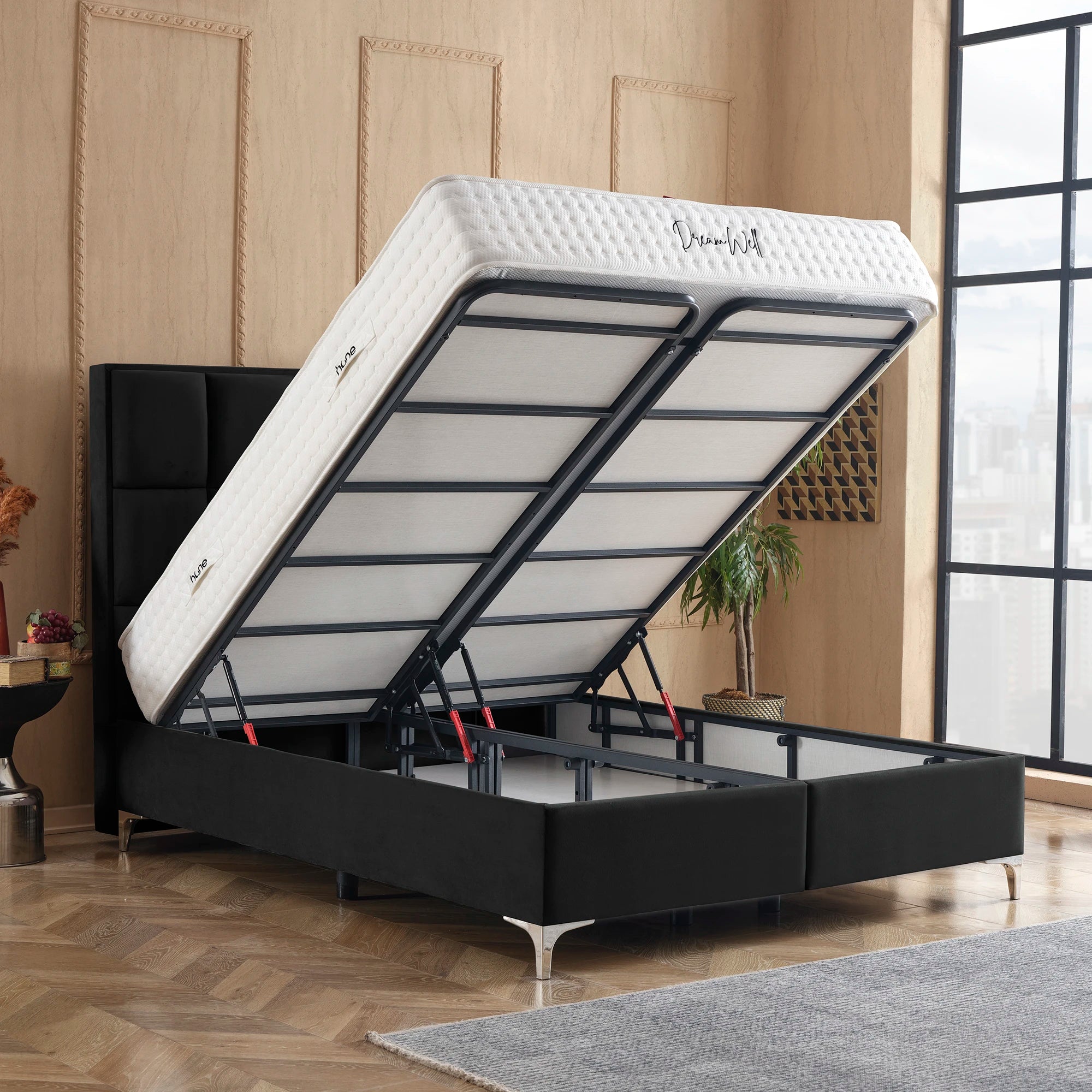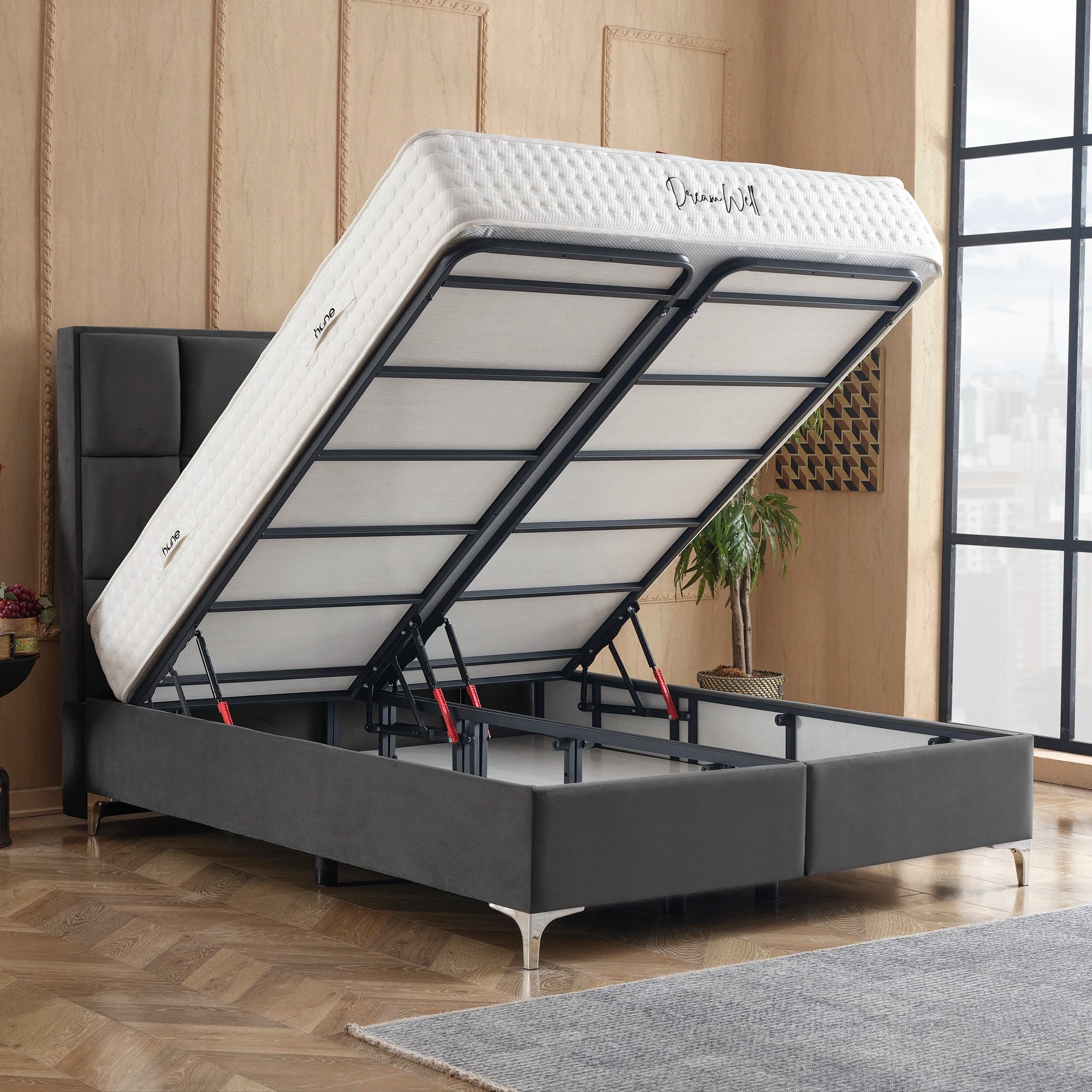 Das Bett mit Bettkasten CASTLE von Hane® verbindet modernes Design, luxuriöse Materialien und praktische Funktionalität. Der samtweiche Veloursstoff sorgt für eine edle Haptik und verleiht deinem Schlafzimmer eine elegante Atmosphäre. Der großzügige Bettkasten bietet ausreichend Stauraum für Bettwäsche, Decken und mehr, während der stabile Hebemechanismus eine einfache Handhabung ermöglicht. Die enthaltene DreamWell-Matratze mit 7-Zonen-Taschenfederkern sorgt für ergonomischen Komfort und eine punktelastische Unterstützung. Durch anpassbare Farben für Bett und Füße fügt sich das Bett CASTLE nahtlos in jeden Einrichtungsstil ein – die perfekte Kombination aus Stil, Komfort und Funktionalität.