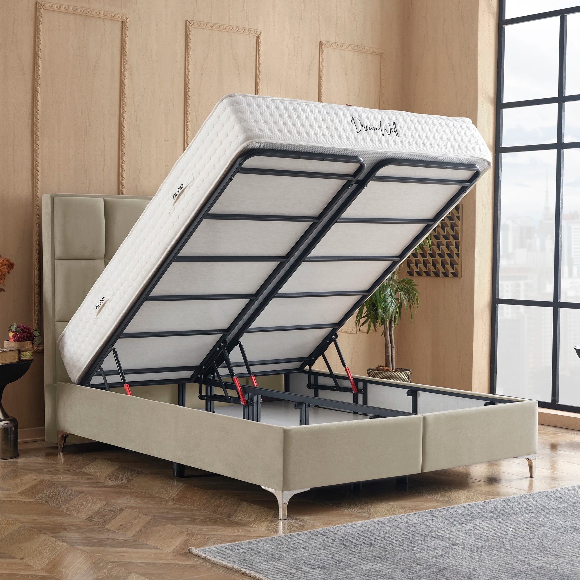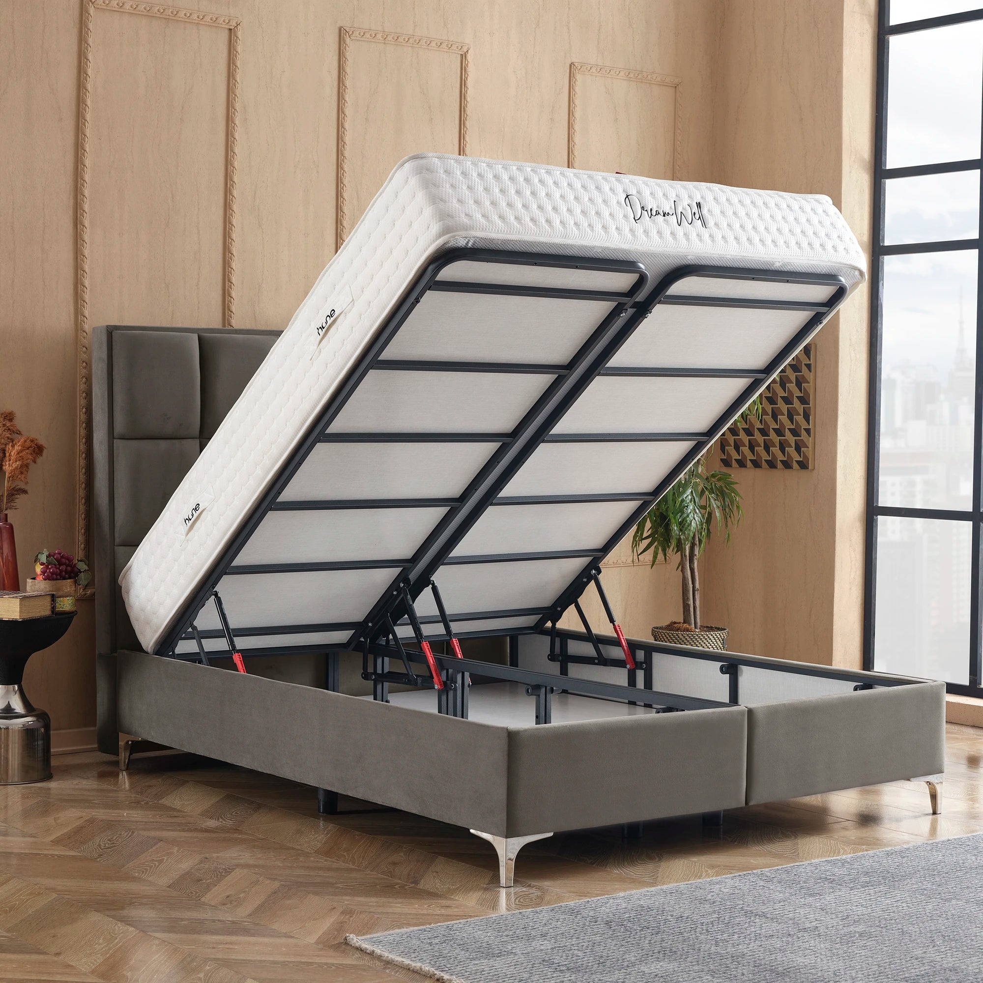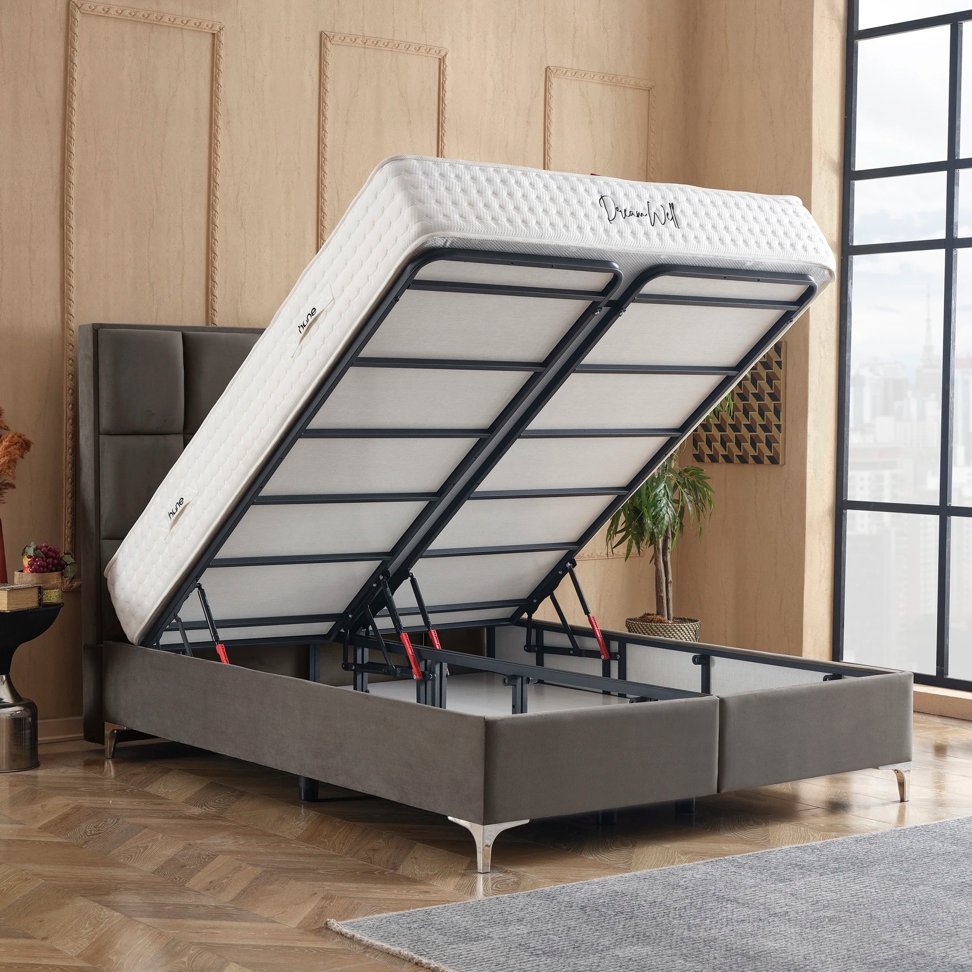 Das Bett mit Bettkasten CASTLE von Hane® verbindet modernes Design, luxuriöse Materialien und praktische Funktionalität. Der samtweiche Veloursstoff sorgt für eine edle Haptik und verleiht deinem Schlafzimmer eine elegante Atmosphäre. Der großzügige Bettkasten bietet ausreichend Stauraum für Bettwäsche, Decken und mehr, während der stabile Hebemechanismus eine einfache Handhabung ermöglicht. Die enthaltene DreamWell-Matratze mit 7-Zonen-Taschenfederkern sorgt für ergonomischen Komfort und eine punktelastische Unterstützung. Durch anpassbare Farben für Bett und Füße fügt sich das Bett CASTLE nahtlos in jeden Einrichtungsstil ein – die perfekte Kombination aus Stil, Komfort und Funktionalität.