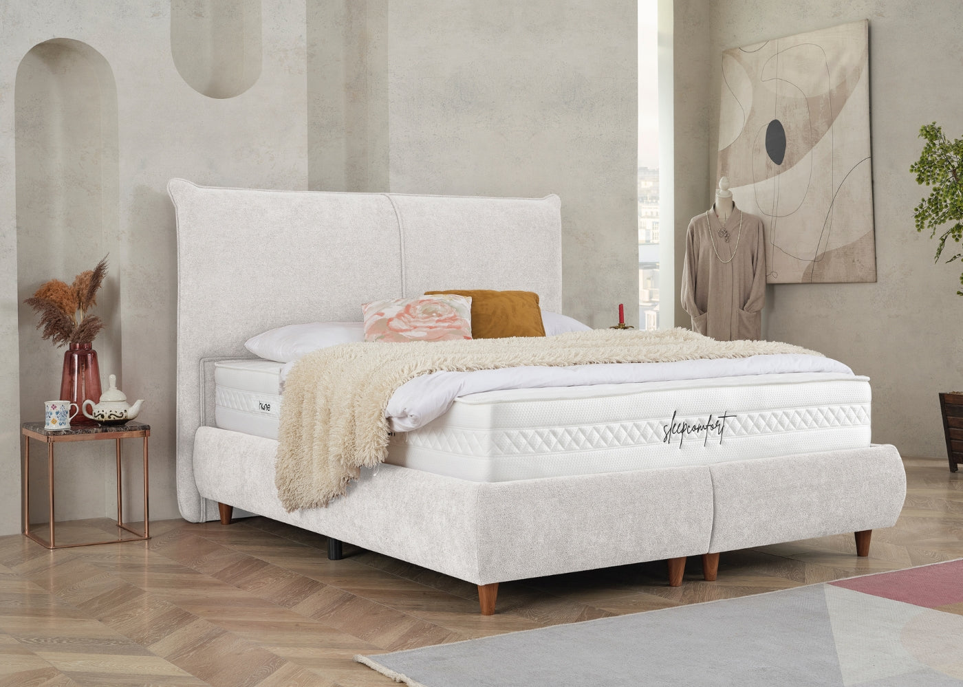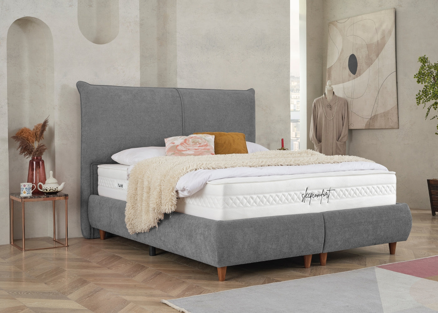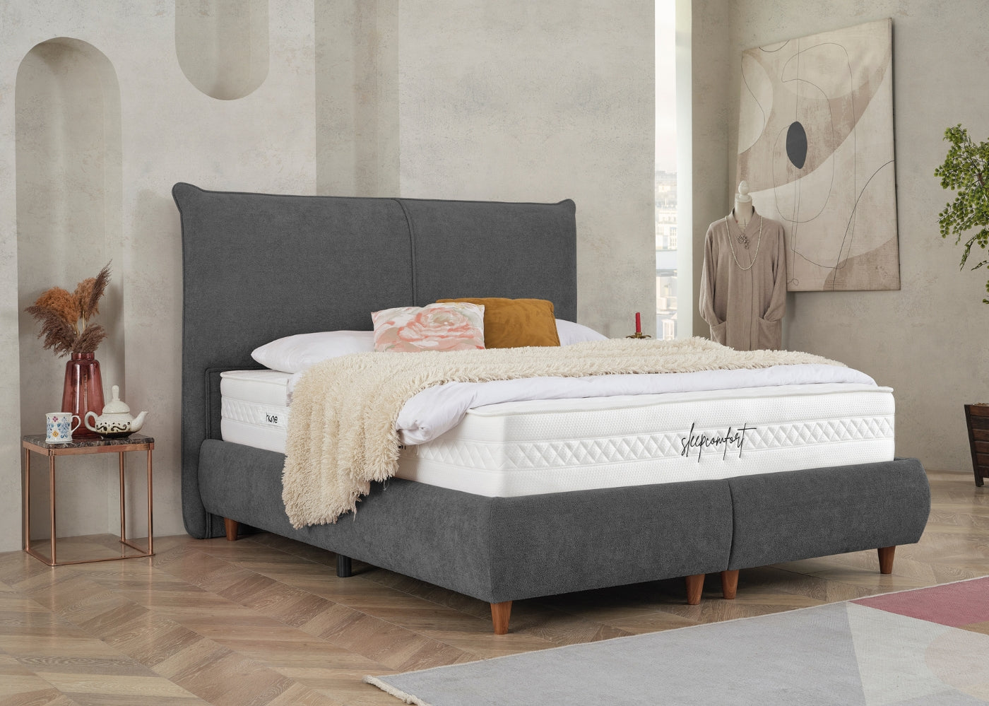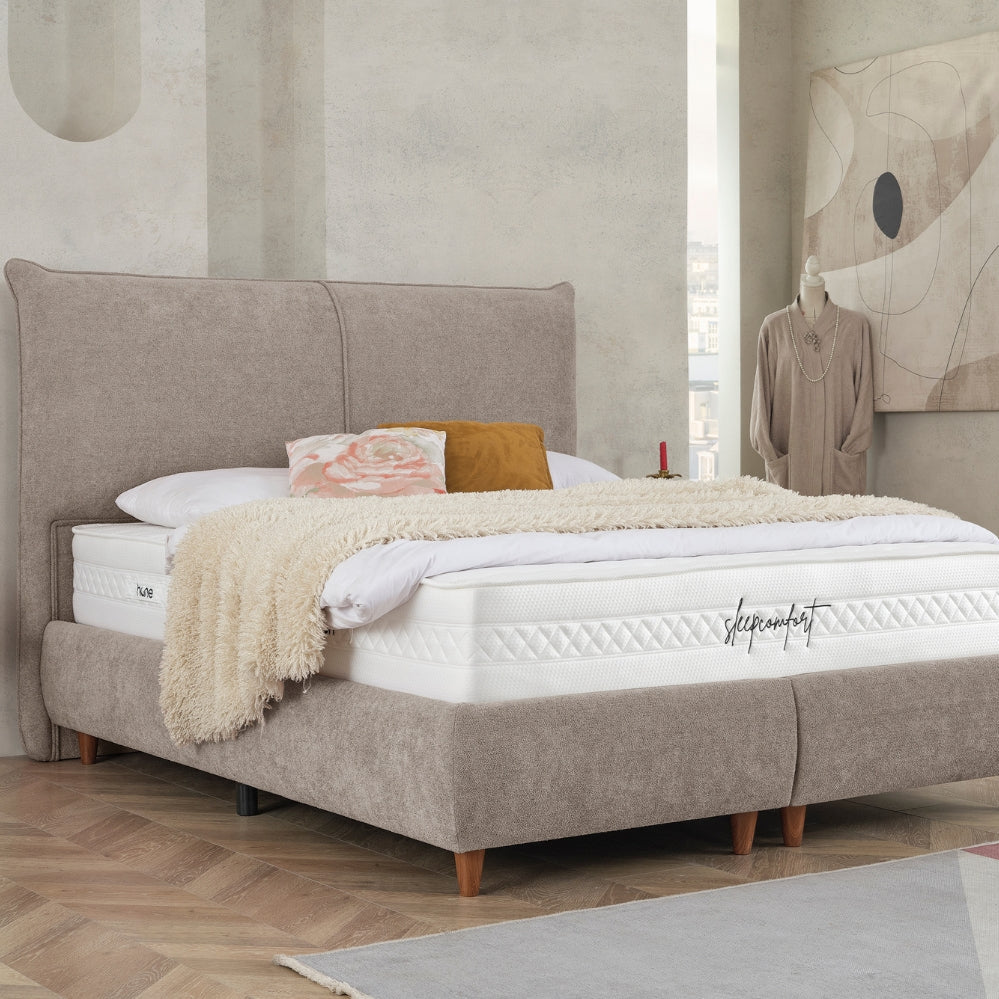 Das CATERA Bett mit Bettkasten kombiniert modernes Design mit praktischer Funktionalität und maximalem Komfort. Der weiche Bouclé-Stoff mit seinem dezenten Glanz verleiht dem Bett eine edle Optik und eine angenehme Haptik. Das sanft geschwungene Kopfteil sorgt für eine stilvolle Ausstrahlung und bietet bequemen Halt. Der geräumige Bettkasten ermöglicht eine clevere Stauraumlösung für Bettwäsche und andere Utensilien. Die im Preis enthaltene SleepComfort-Matratze mit 5-Zonen-Taschenfederkern garantiert eine optimale Körperanpassung und erholsamen Schlaf.
