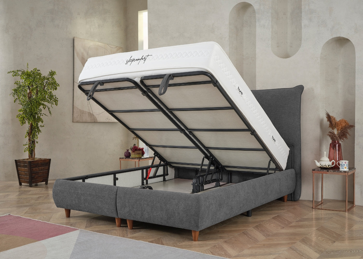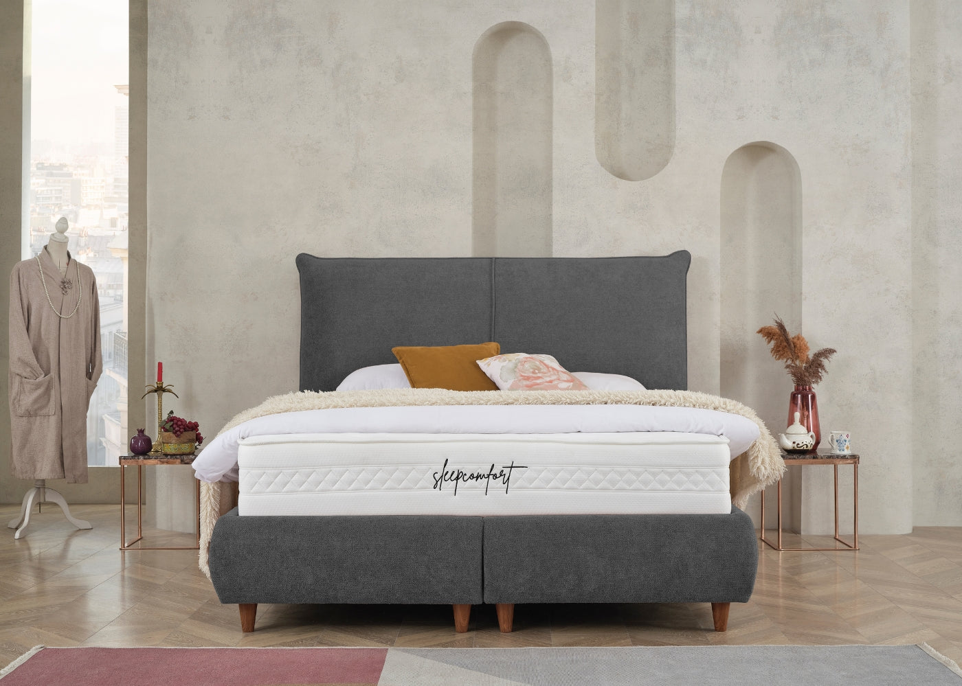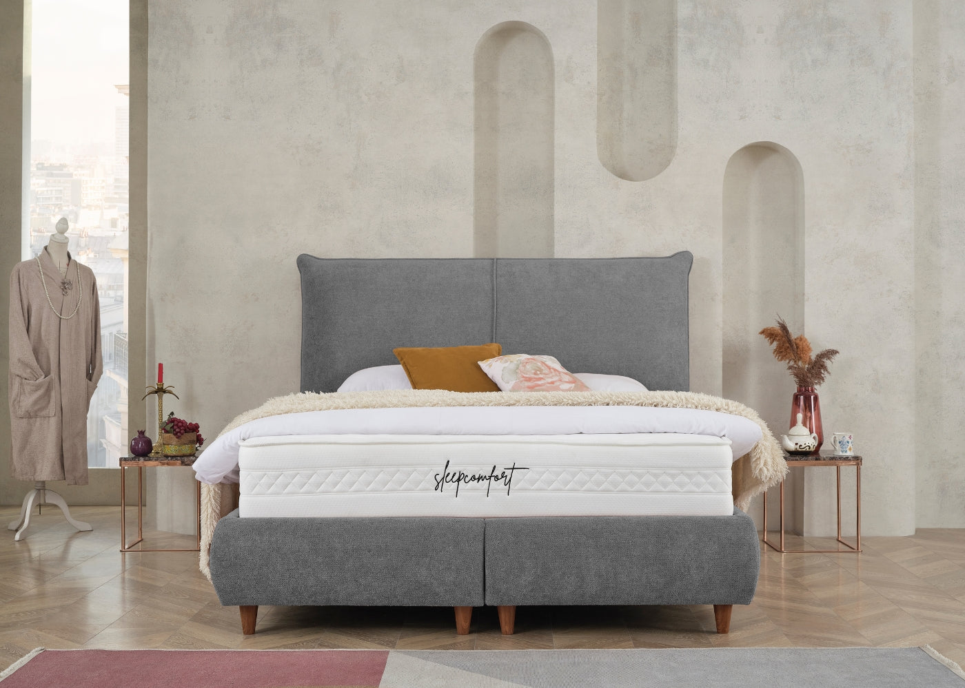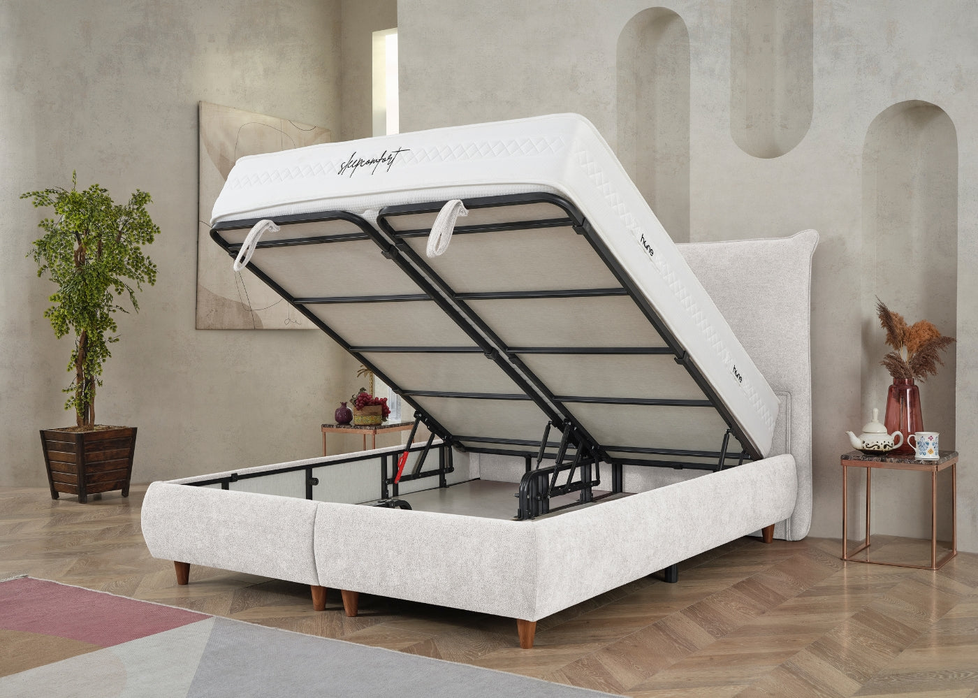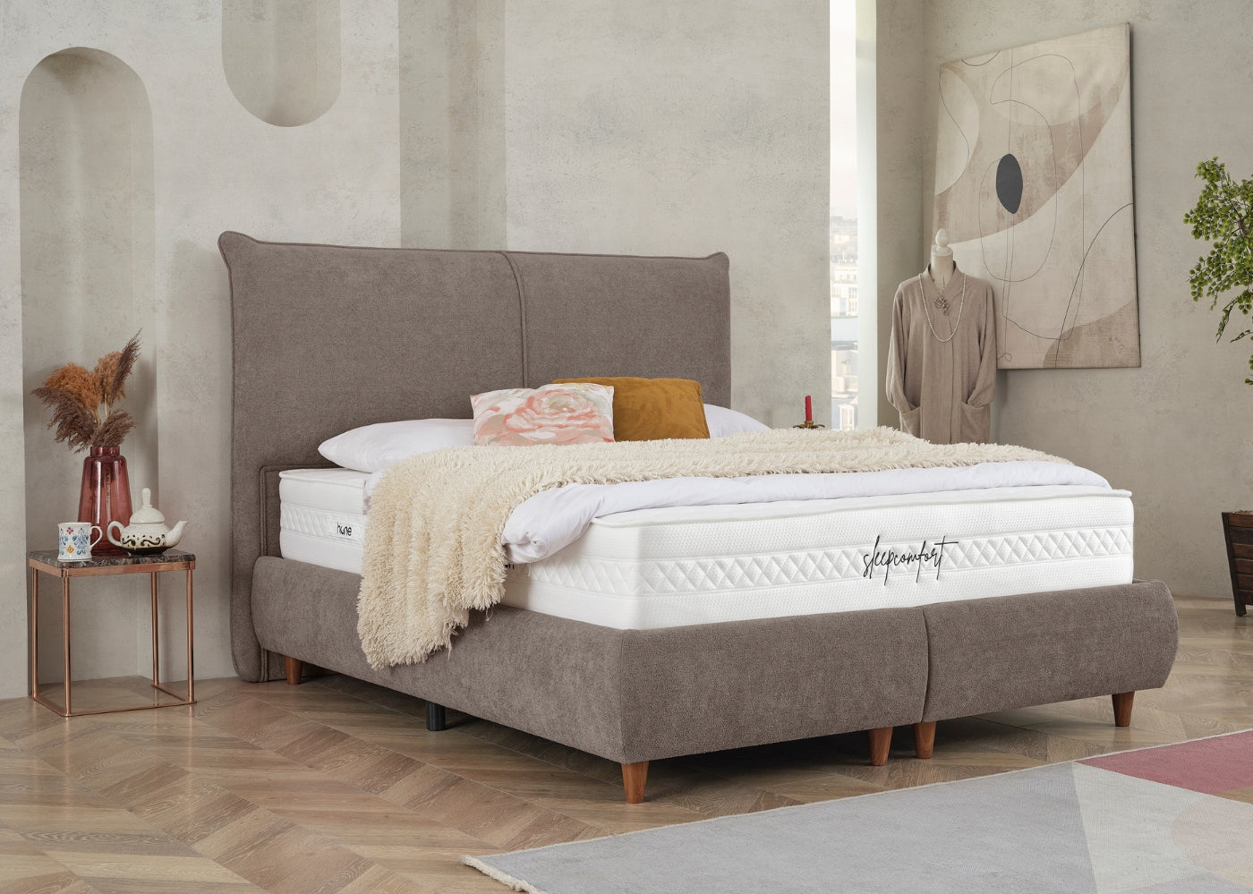 Das CATERA Bett mit Bettkasten kombiniert modernes Design mit praktischer Funktionalität und maximalem Komfort. Der weiche Bouclé-Stoff mit seinem dezenten Glanz verleiht dem Bett eine edle Optik und eine angenehme Haptik. Das sanft geschwungene Kopfteil sorgt für eine stilvolle Ausstrahlung und bietet bequemen Halt. Der geräumige Bettkasten ermöglicht eine clevere Stauraumlösung für Bettwäsche und andere Utensilien. Die im Preis enthaltene SleepComfort-Matratze mit 5-Zonen-Taschenfederkern garantiert eine optimale Körperanpassung und erholsamen Schlaf.