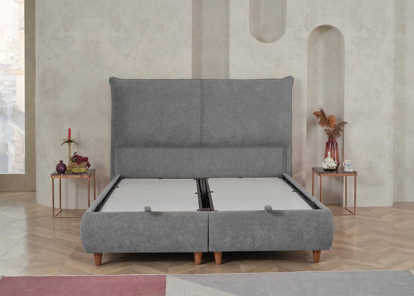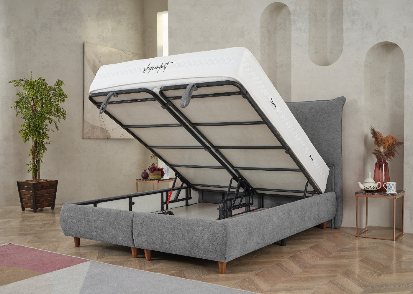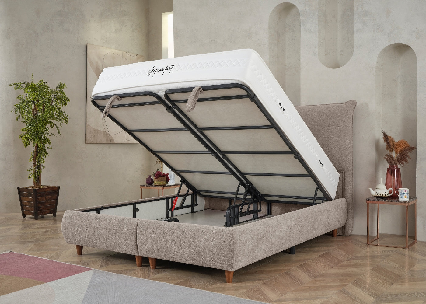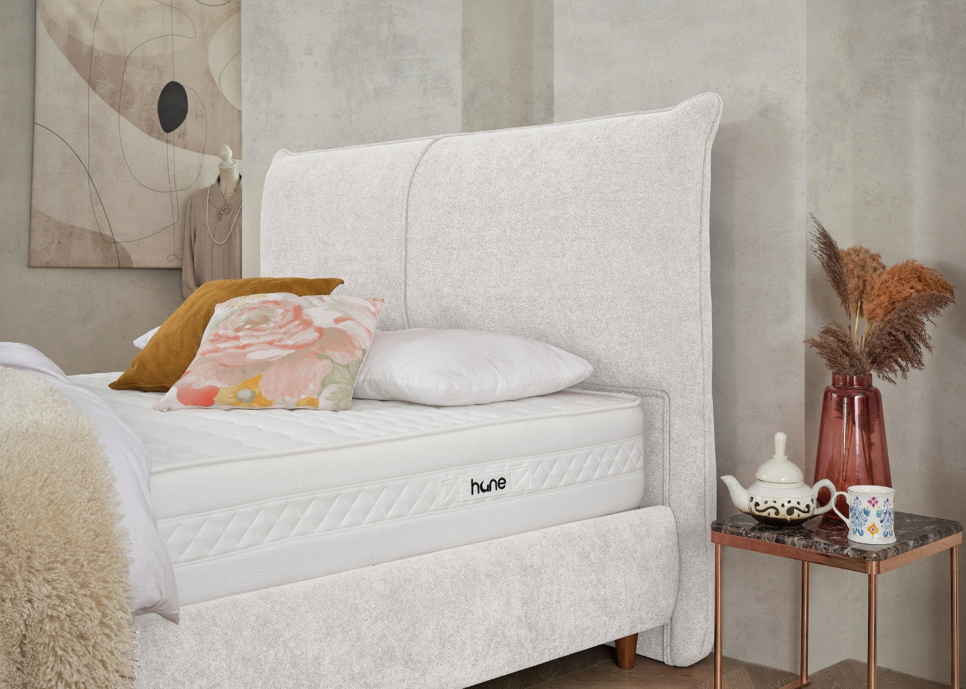 Das CATERA Bett mit Bettkasten kombiniert modernes Design mit praktischer Funktionalität und maximalem Komfort. Der weiche Bouclé-Stoff mit seinem dezenten Glanz verleiht dem Bett eine edle Optik und eine angenehme Haptik. Das sanft geschwungene Kopfteil sorgt für eine stilvolle Ausstrahlung und bietet bequemen Halt. Der geräumige Bettkasten ermöglicht eine clevere Stauraumlösung für Bettwäsche und andere Utensilien. Die im Preis enthaltene SleepComfort-Matratze mit 5-Zonen-Taschenfederkern garantiert eine optimale Körperanpassung und erholsamen Schlaf.