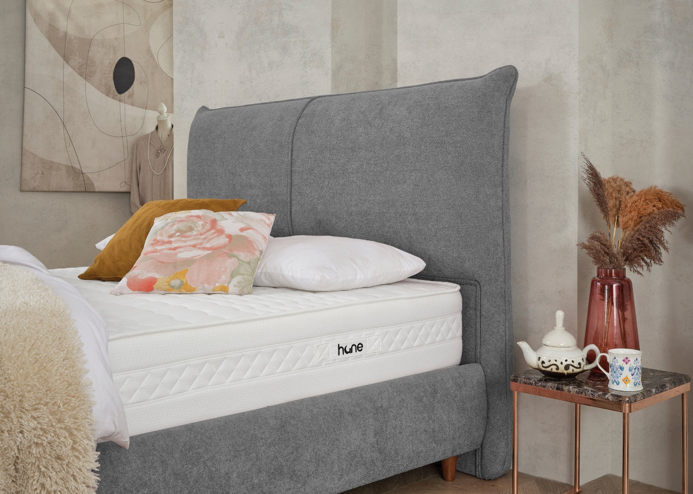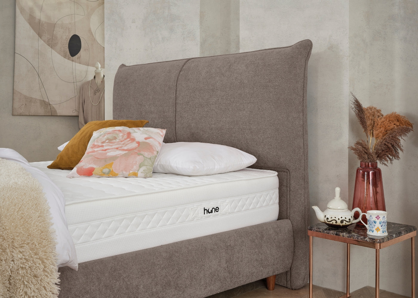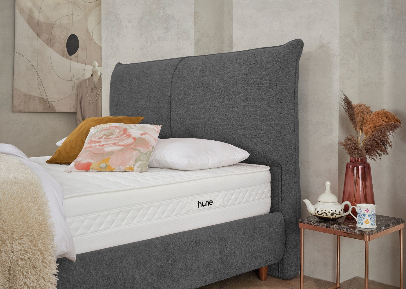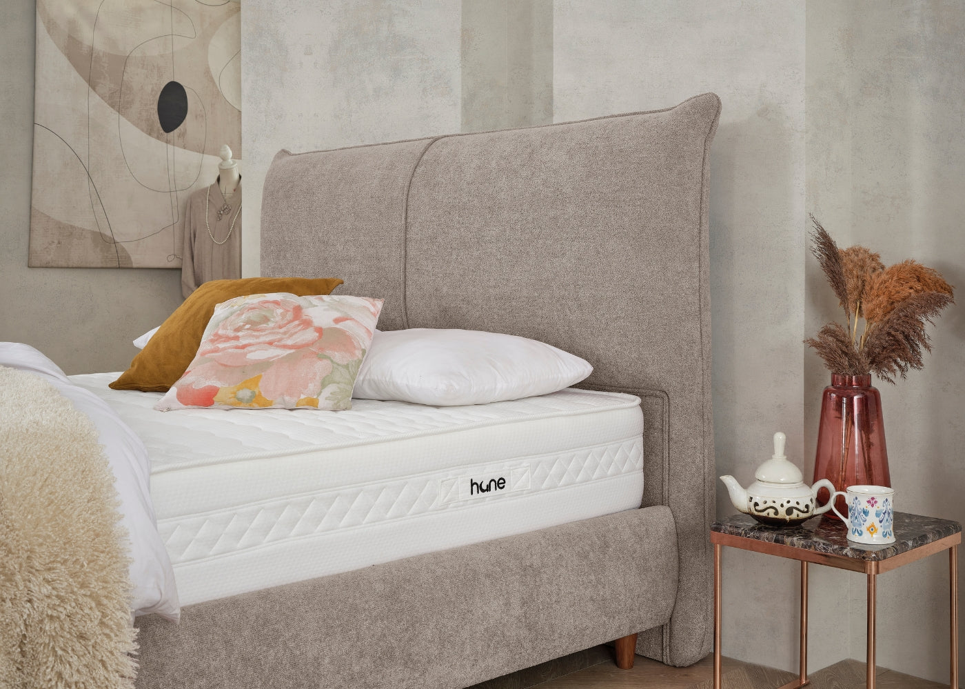 Das CATERA Bett mit Bettkasten kombiniert modernes Design mit praktischer Funktionalität und maximalem Komfort. Der weiche Bouclé-Stoff mit seinem dezenten Glanz verleiht dem Bett eine edle Optik und eine angenehme Haptik. Das sanft geschwungene Kopfteil sorgt für eine stilvolle Ausstrahlung und bietet bequemen Halt. Der geräumige Bettkasten ermöglicht eine clevere Stauraumlösung für Bettwäsche und andere Utensilien. Die im Preis enthaltene SleepComfort-Matratze mit 5-Zonen-Taschenfederkern garantiert eine optimale Körperanpassung und erholsamen Schlaf.