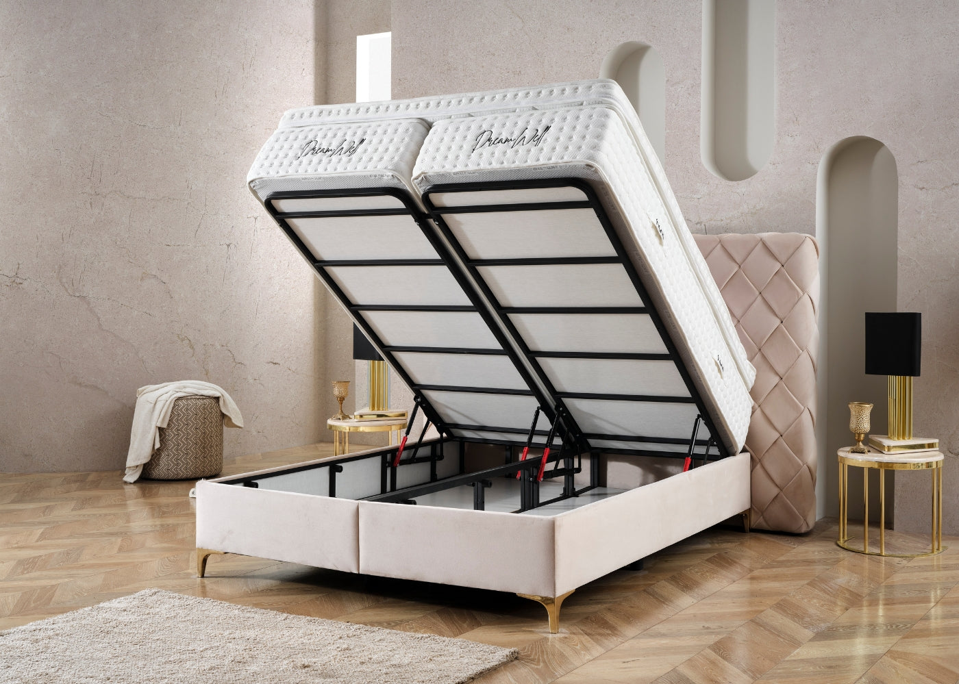 Das Bett mit Bettkasten CROSS von Hane® kombiniert modernes Design, großzügigen Stauraum und luxuriösen Schlafkomfort. Das elegante Kopfteil mit Diamantmuster verleiht deinem Schlafzimmer eine stilvolle Note, während der geräumige Bettkasten mit einem stabilen Hebemechanismus dir zusätzlichen Platz für Bettwäsche und persönliche Gegenstände bietet. Die enthaltene DreamWell-Matratze, mit 7-Zonen-Taschenfederkern und atmungsaktivem Bezug, sorgt für ein gesundes Schlafklima und optimalen Komfort. Dank anpassbarer Farben und Füße passt sich das Bett perfekt an deinen Stil an – ideal für funktionale und ästhetische Schlafzimmer.