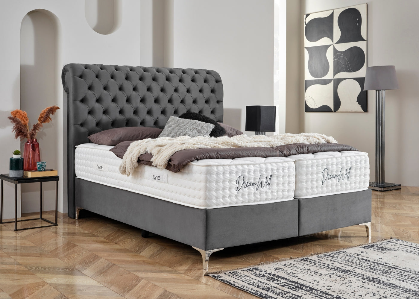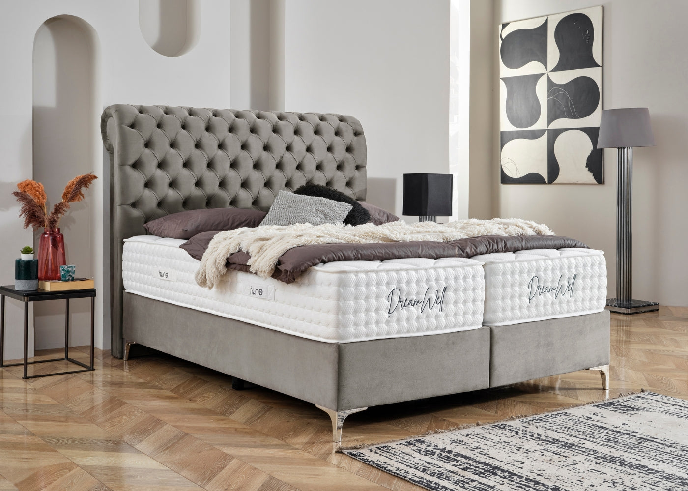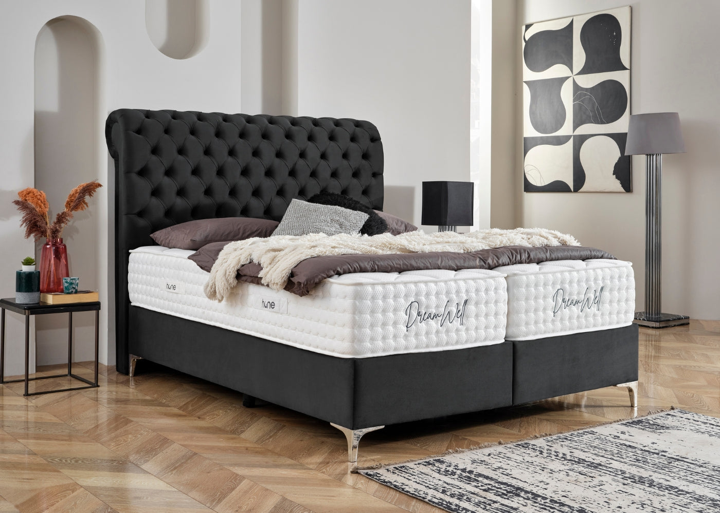 Das Bett mit Bettkasten NEW MONTANA von Hane® kombiniert luxuriösen Schlafkomfort mit funktionaler Eleganz. Das weich gepolsterte, elegante Kopfteil verleiht deinem Schlafzimmer eine stilvolle und moderne Ausstrahlung, während die hochwertige Verarbeitung für langanhaltende Stabilität sorgt. Der integrierte Bettkasten bietet großzügigen Stauraum für Bettwäsche und mehr und lässt sich dank des stabilen Hebemechanismus mühelos öffnen. Die im Preis enthaltene DreamWell-Matratze mit 7-Zonen-Taschenfederkern garantiert optimale Unterstützung und ein gesundes Schlafklima. Mit anpassbaren Farben für Stoff und Füße passt sich das Bett perfekt an jedes Wohnkonzept an – eine ideale Kombination aus Stil, Funktionalität und höchstem Komfort.