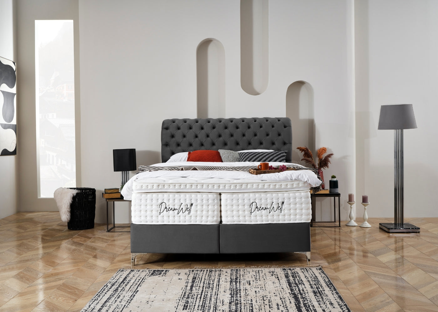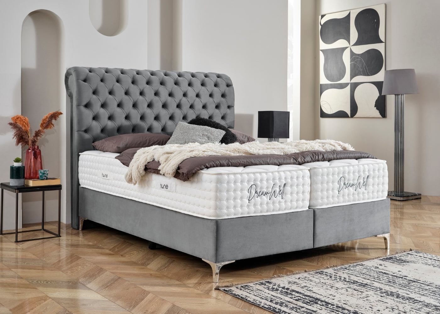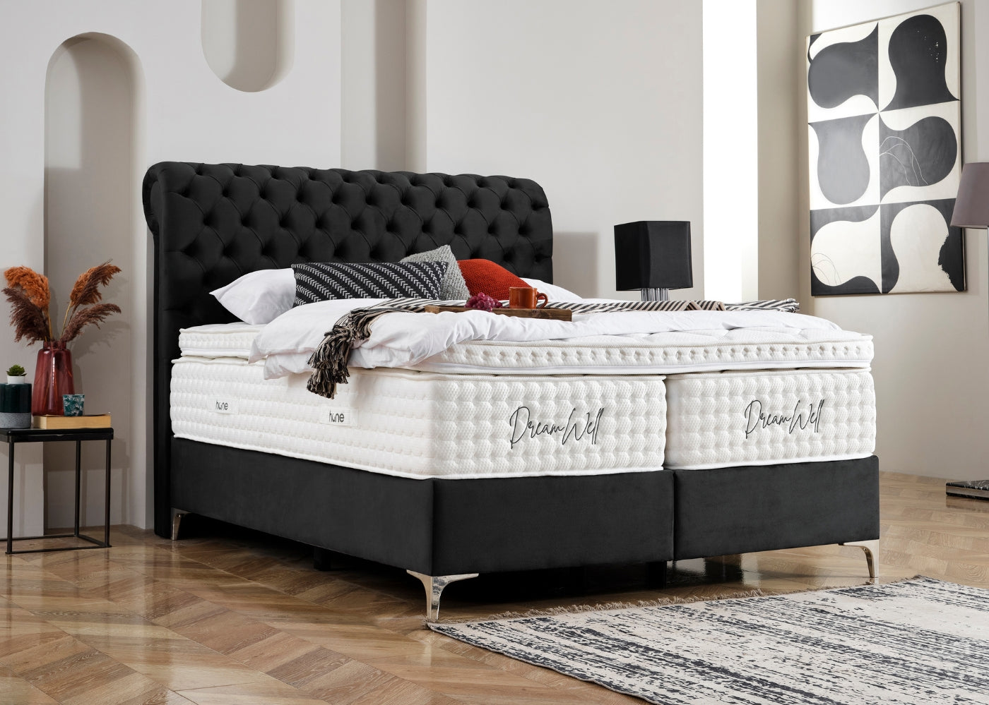 Das Bett mit Bettkasten NEW MONTANA von Hane® kombiniert luxuriösen Schlafkomfort mit funktionaler Eleganz. Das weich gepolsterte, elegante Kopfteil verleiht deinem Schlafzimmer eine stilvolle und moderne Ausstrahlung, während die hochwertige Verarbeitung für langanhaltende Stabilität sorgt. Der integrierte Bettkasten bietet großzügigen Stauraum für Bettwäsche und mehr und lässt sich dank des stabilen Hebemechanismus mühelos öffnen. Die im Preis enthaltene DreamWell-Matratze mit 7-Zonen-Taschenfederkern garantiert optimale Unterstützung und ein gesundes Schlafklima. Mit anpassbaren Farben für Stoff und Füße passt sich das Bett perfekt an jedes Wohnkonzept an – eine ideale Kombination aus Stil, Funktionalität und höchstem Komfort.
