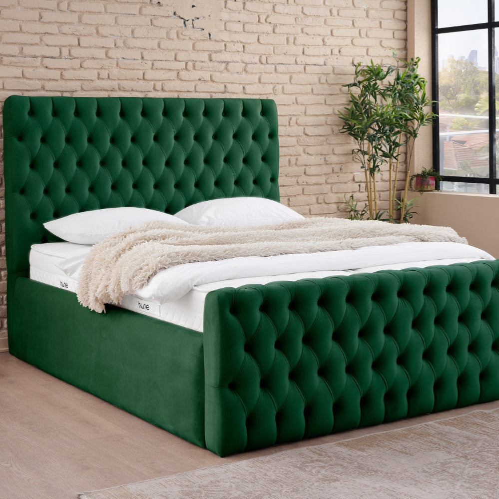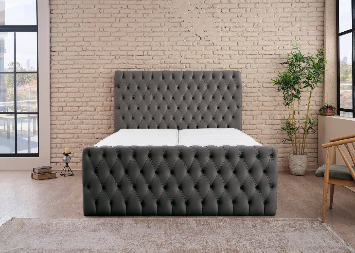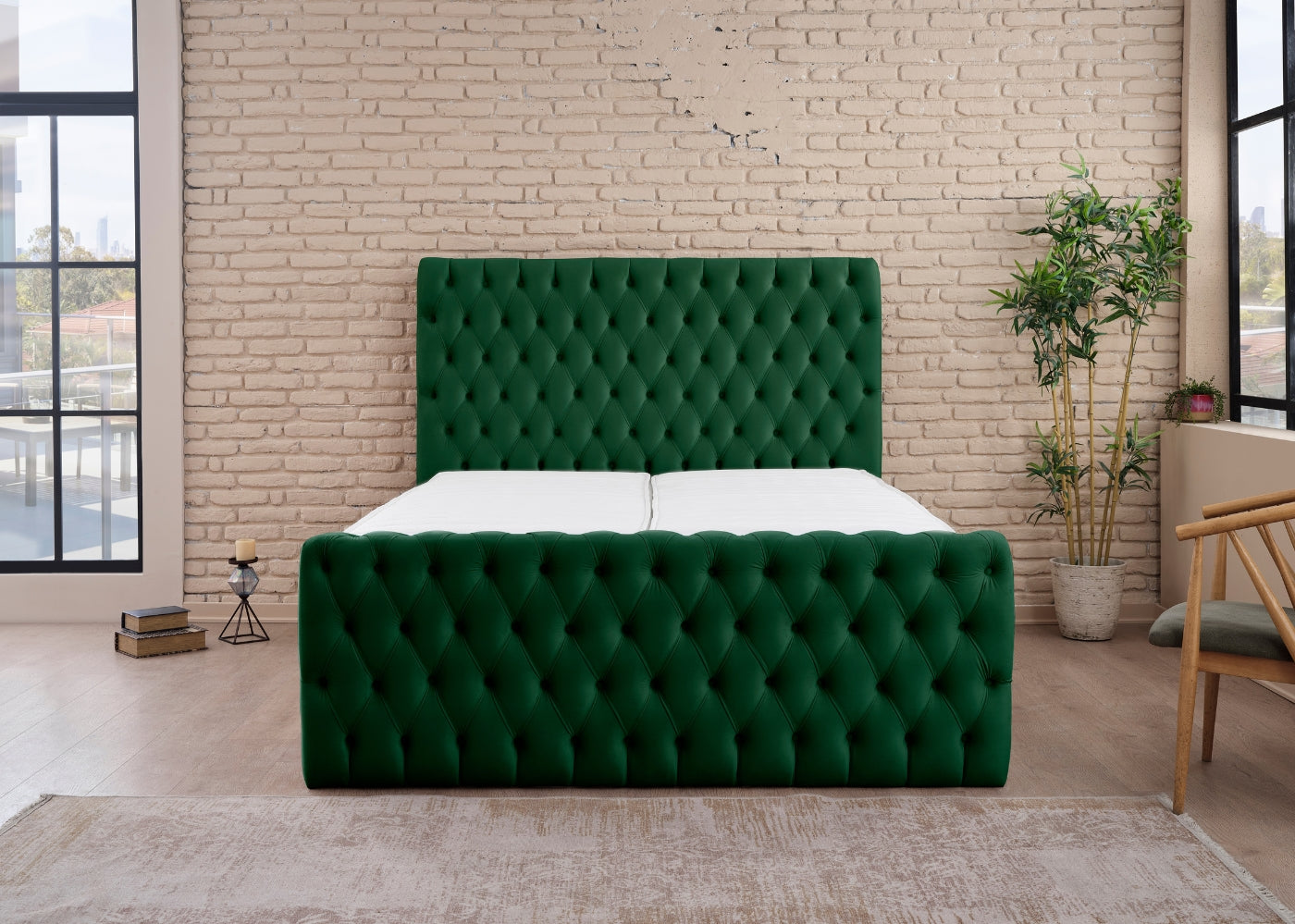 Das Roma Duo Bett verbindet luxuriöses Chesterfield-Design mit modernem Komfort. Das edel gepolsterte Kopfteil mit handgefertigten Knopfheftungen und der samtige Stoffbezug sorgen für eine stilvolle und luxuriöse Ausstrahlung, die jedes Schlafzimmer aufwertet. Die sanften Kurven und die tiefe Polsterung bieten nicht nur eine elegante Optik, sondern auch außergewöhnlichen Komfort. Der hohe Kopfteil eignet sich perfekt zum Anlehnen und schafft eine gemütliche Atmosphäre. Dieses Bett vereint klassischen Stil und hochwertige Funktionalität – die perfekte Wahl für anspruchsvolle Schlafzimmer.