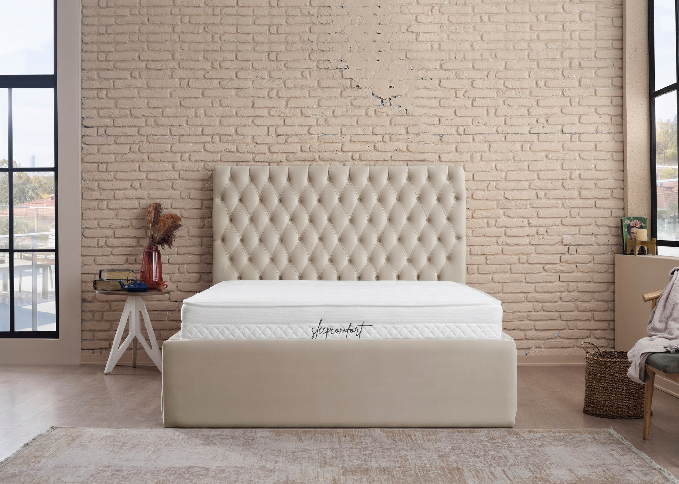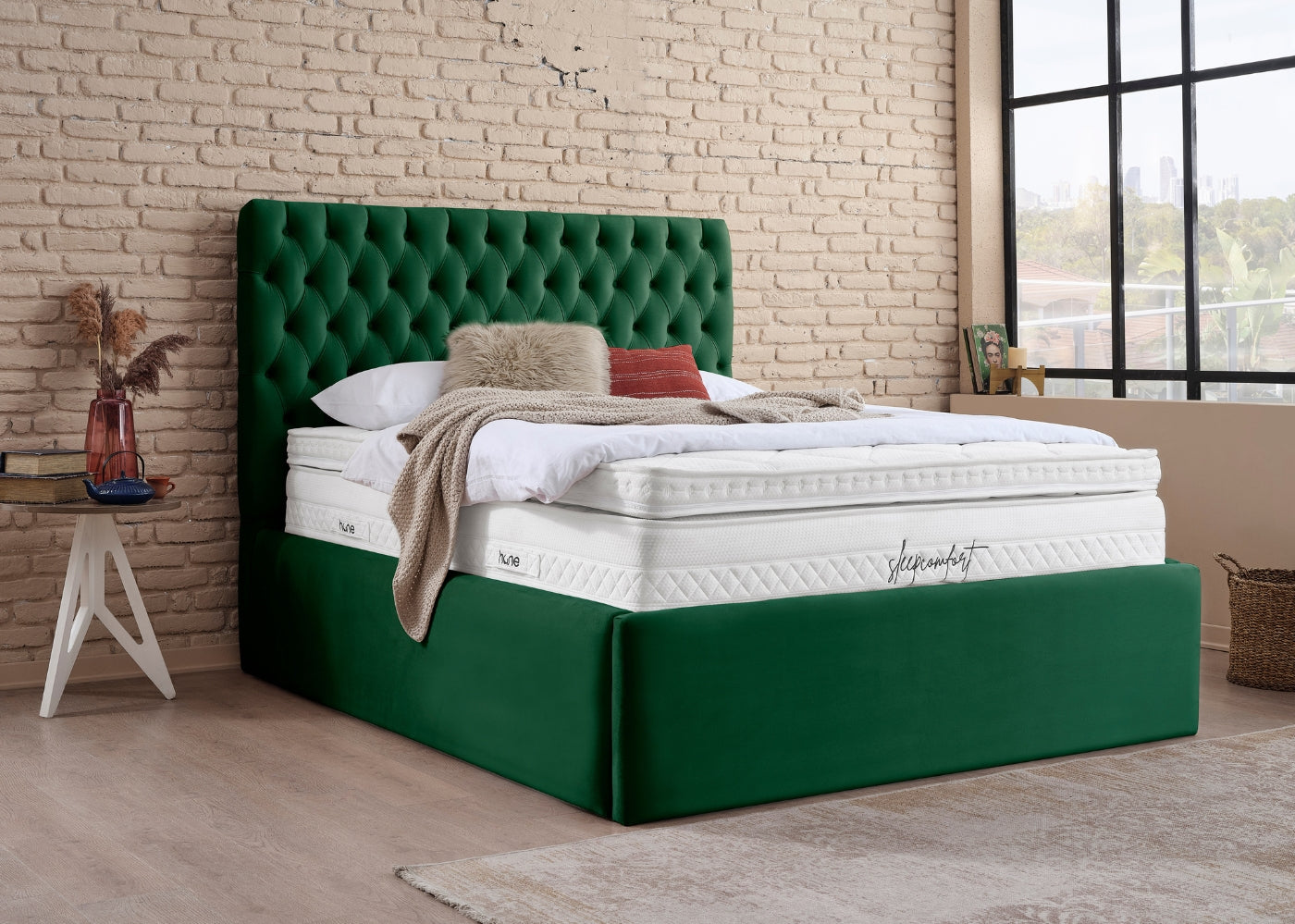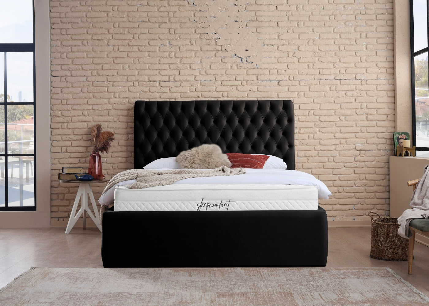 Das ROMA ONE Bett mit Bettkasten vereint stilvolles Design mit durchdachter Funktionalität. Das markante Kopfteil im Chesterfield-Stil zieht alle Blicke auf sich und verleiht deinem Schlafzimmer eine luxuriöse Ausstrahlung. Der hochwertige, weiche Samtstoff fühlt sich angenehm an und sorgt für eine edle Optik. Der großzügige Bettkasten bietet viel Stauraum für Bettwäsche und persönliche Gegenstände, während der stabile Hebemechanismus den Zugriff mühelos ermöglicht. Die im Preis enthaltene SleepComfort-Matratze mit 5-Zonen-Taschenfederkern sorgt für optimalen Schlafkomfort und eine gesunde Körperanpassung. Dieses Bett ist die perfekte Wahl für alle, die Stil, Komfort und Funktionalität vereinen möchten.