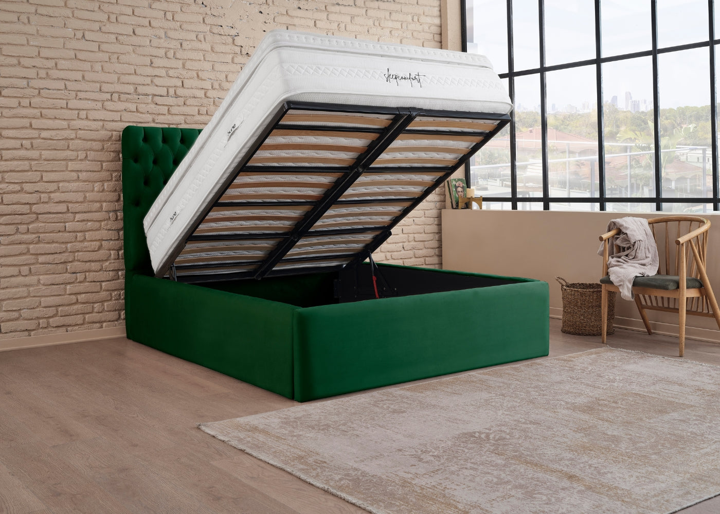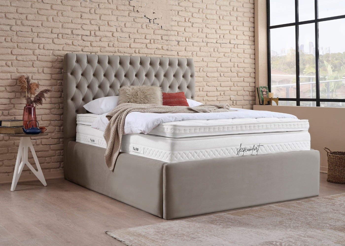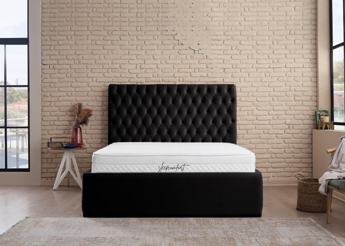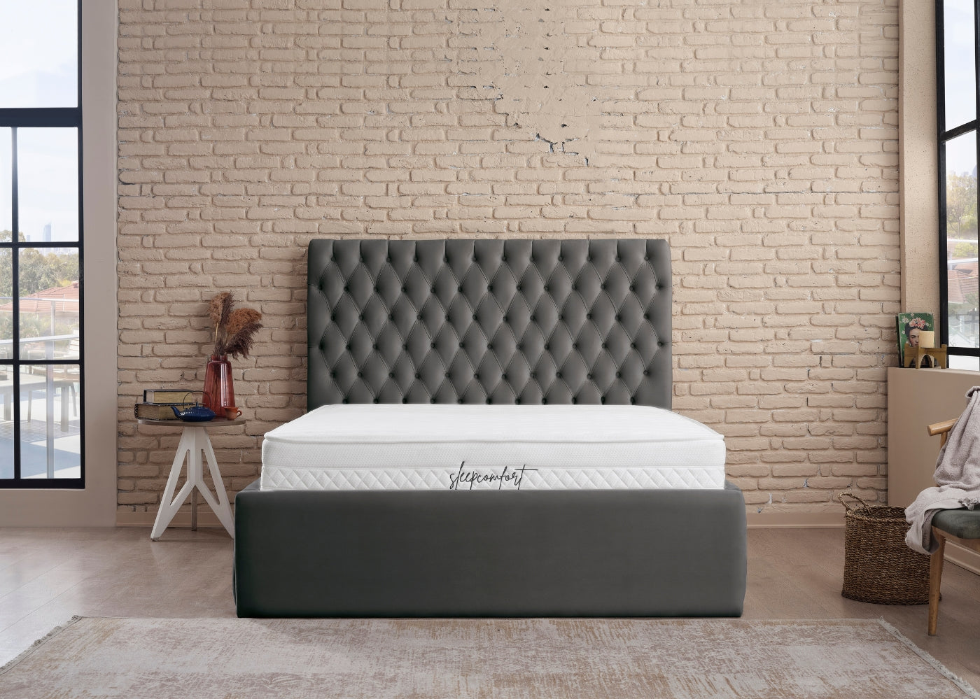 Das ROMA ONE Bett mit Bettkasten vereint stilvolles Design mit durchdachter Funktionalität. Das markante Kopfteil im Chesterfield-Stil zieht alle Blicke auf sich und verleiht deinem Schlafzimmer eine luxuriöse Ausstrahlung. Der hochwertige, weiche Samtstoff fühlt sich angenehm an und sorgt für eine edle Optik. Der großzügige Bettkasten bietet viel Stauraum für Bettwäsche und persönliche Gegenstände, während der stabile Hebemechanismus den Zugriff mühelos ermöglicht. Die im Preis enthaltene SleepComfort-Matratze mit 5-Zonen-Taschenfederkern sorgt für optimalen Schlafkomfort und eine gesunde Körperanpassung. Dieses Bett ist die perfekte Wahl für alle, die Stil, Komfort und Funktionalität vereinen möchten.