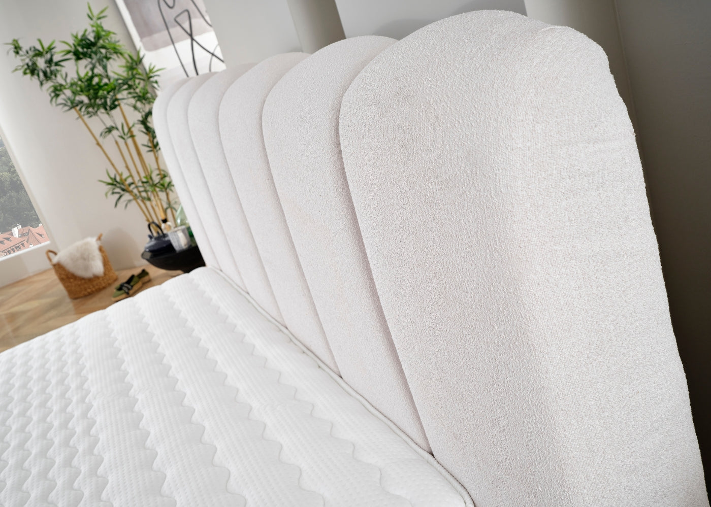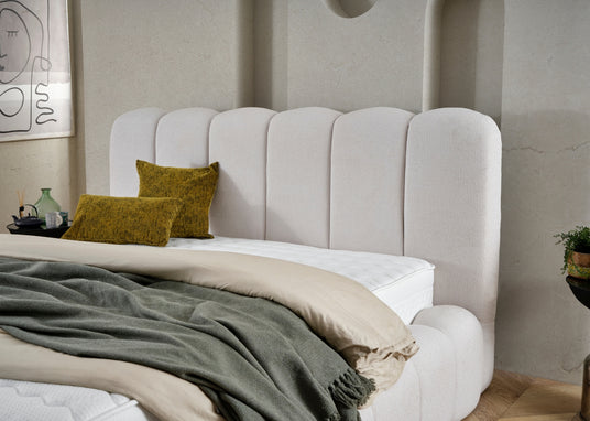 Das Wavy Bett mit Bettkasten ist die perfekte Kombination aus modernem Design und hochwertigem Komfort. Die wellenförmige Linienführung und das sanft abgerundete Kopfteil verleihen dem Bett eine harmonische, einladende Ausstrahlung. Der pflegeleichte Bouclé-Stoff in Off White sorgt nicht nur für eine angenehme Haptik, sondern auch für eine frische und elegante Optik, die sich mühelos in jedes Raumkonzept einfügt. Der integrierte Bettkasten bietet praktischen Stauraum, während die großzügige Polsterung für optimalen Schlafkomfort sorgt.