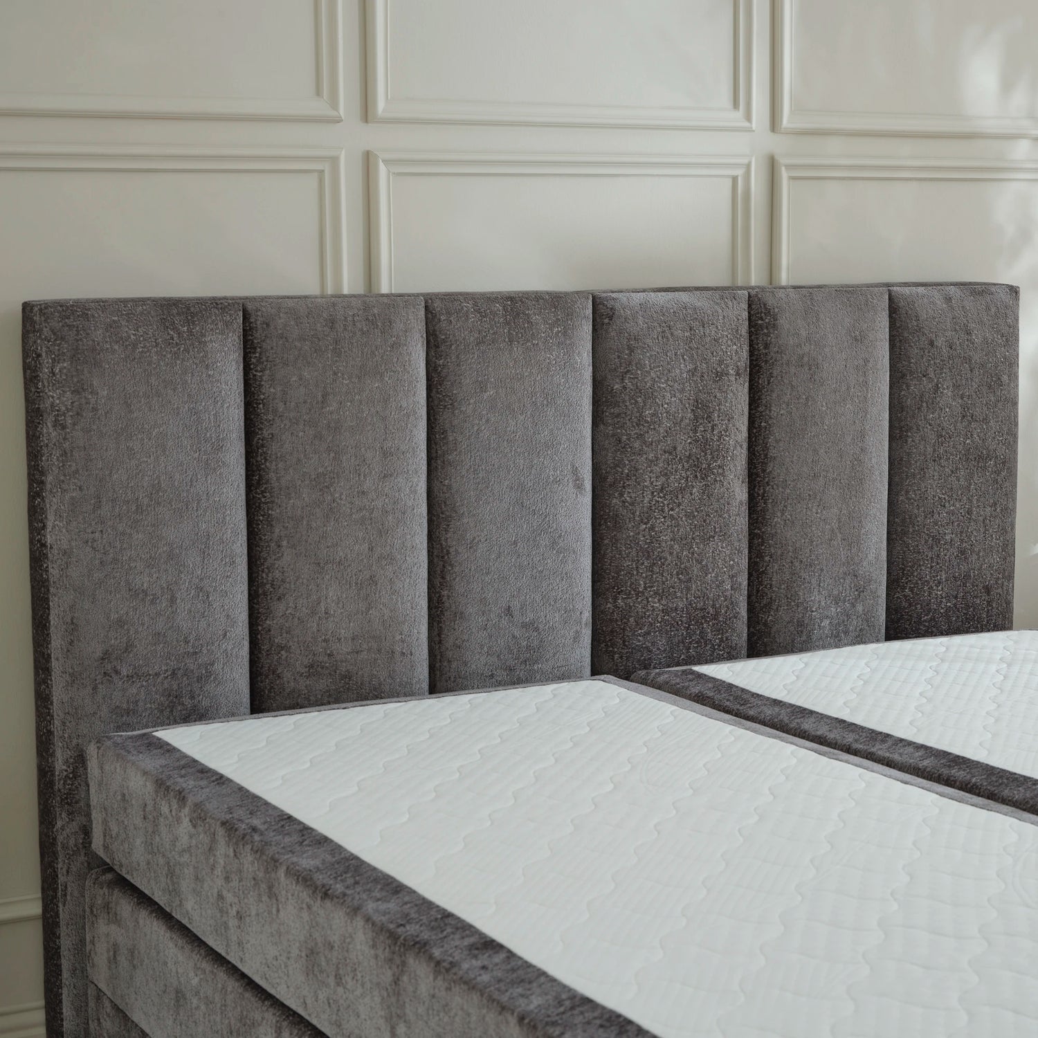 - Das hohe Kopfteil mit vertikalen Paneelen wirkt grafisch und wertig.