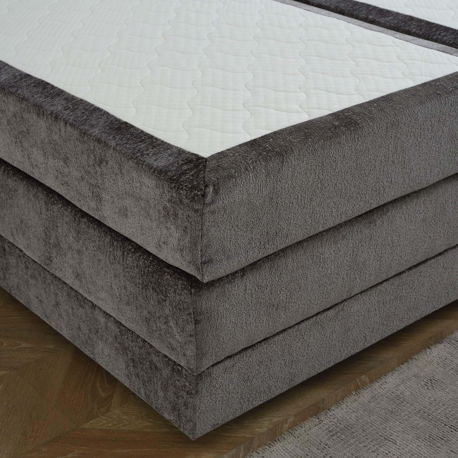 Das Boxspringbett OSCAR Boucle elektrisch verstellbar mit Matratze und Hybrid-Topper ist gemacht für alle, die Design, Technik und Komfort in einem Paket suchen. Das vertikal strukturierte Kopfteil verleiht dem Bett eine klare, ruhige Optik, während der Boucle-Stoff für eine weiche, wohnliche Haptik sorgt. Im Inneren arbeiten zwei 7-Zonen-Taschenfederkernmatratzen, die deinen Körper orthopädisch unterstützen und Schulter, Rücken und Becken gezielt entlasten. Obenauf liegt ein spezieller Hybrid-Schaum-Topper, der Druck angenehm verteilt, für gute Luftzirkulation sorgt und dank waschbarem Bezug besonders pflegeleicht ist. Über die elektrische Verstellung stellst du jede Bettseite individuell ein – vom aufrechten Lesen bis zur entspannten Relax-Position. Anti-Slip-Flächen und Halterungen verhindern, dass Matratzen und Topper verrutschen, selbst wenn du häufig die Position änderst. So wird OSCAR zu deiner persönlichen Komfortzone, in der du Liegegefühl, Haltung und Komfort jeden Abend neu bestimmst.