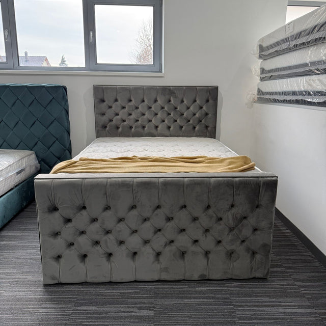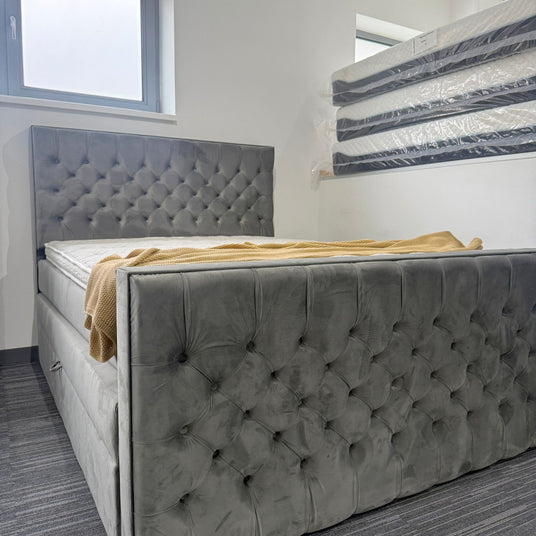 CHESTER DUO ist ein Statement-Bett für alle, die Eleganz lieben. Das Chesterfield-Muster am Kopf- und Fußteil verleiht ihm einen royalen Charakter, während das bodennahe Design für Stabilität und eine wertige Optik sorgt. Gleichzeitig bietet der integrierte Stauraum jede Menge Platz und macht das Bett nicht nur schön, sondern auch praktisch. Die 160×200-Liegefläche in Kombination mit dem Boxspring-Komfort schafft einen besonders erholsamen Schlafplatz mit stilvollem Auftritt.