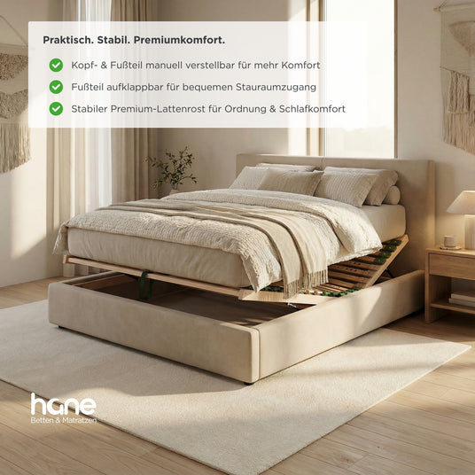 - Fußteil aufklappbar für bequemen Stauraumzugang