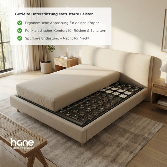 Im Gegensatz zu klassischen Lattenrosten bietet das Teller-System eine multidimensionale Anpassung, die besonders für anspruchsvolle Schläfer geeignet ist. Der ErgoFlex unterstützt eine natürliche Schlafhaltung und trägt spürbar zu entspanntem Liegen und erholsamem Schlaf bei.