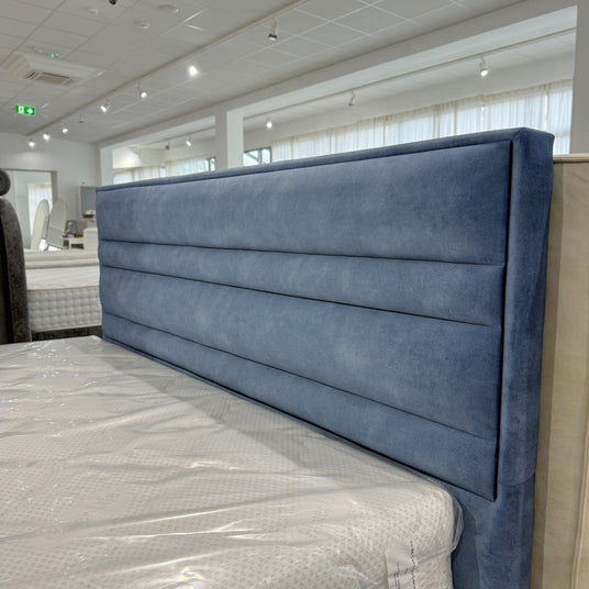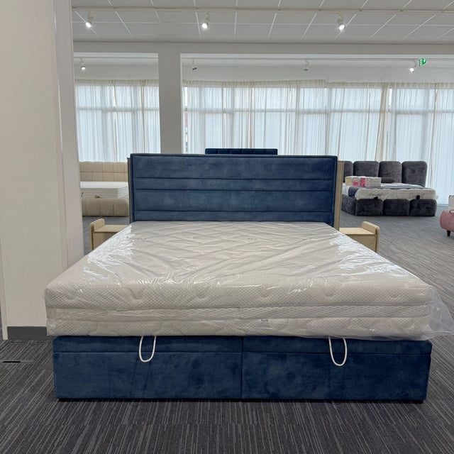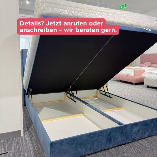 Das GENESIS Bett kombiniert ein beruhigendes, tiefes Abyss-Blue mit einem angenehm gepolsterten Kopfteil und besonders großzügigem Stauraum. Durch die eleganten 1-cm-Füße wirkt das Bett modern, stabil und nahezu schwebend.