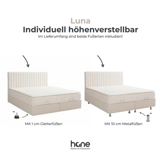 Das Luna Bett bringt Luxus und intelligente Funktion in dein Schlafzimmer. Das elegant gesteppte Kopfteil aus weichem Velvet-Stoff lädt zum Entspannen ein und wirkt besonders stilvoll, egal in welcher Raumfarbe. Die mitgelieferte Luna Matratze bietet mit Federkern und integriertem Topper optimale Unterstützung für alle Körperzonen. Dank der H3-Festigkeit eignet sie sich für verschiedenste Körpergewichte und garantiert komfortablen Schlaf. Die hochwertige Bettkasten-Konstruktion sorgt mit stabilen Gasdruckhebern und hoher Belastbarkeit dafür, dass du Stauraum sicher und bequem nutzen kannst. Füße oder Gleiter sind flexibel montierbar – so passt Luna perfekt zu deinen Wünschen und bleibt dauerhaft schön und funktional.