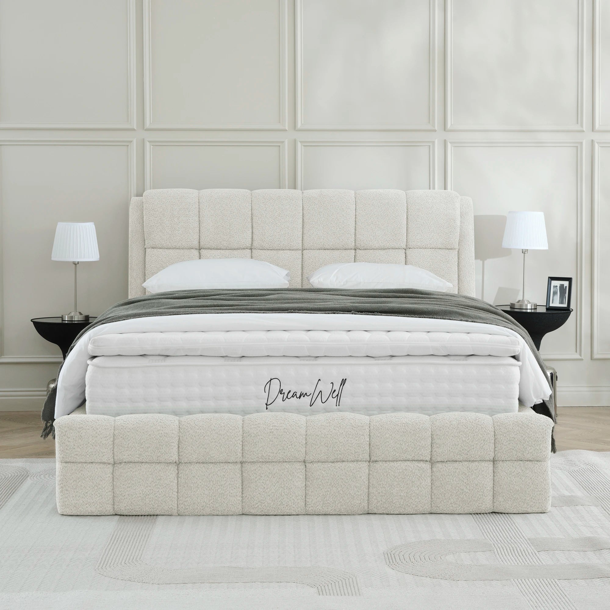 Posteľ MILA zaujme svojím moderným, no zároveň útulným vzhľadom. Zamatovo mäkká buklé látka v svetlom krémovom odtieni dodáva posteli teplý pocit, zatiaľ čo rovnomerné mriežkované prešívanie na čele a nohe postele dodáva štruktúru a eleganciu. Zaoblené, polstrované okraje vytvárajú harmonický celkový vzhľad – ideálny pre štýlové spálne s vysokými nárokmi na pohodlie.