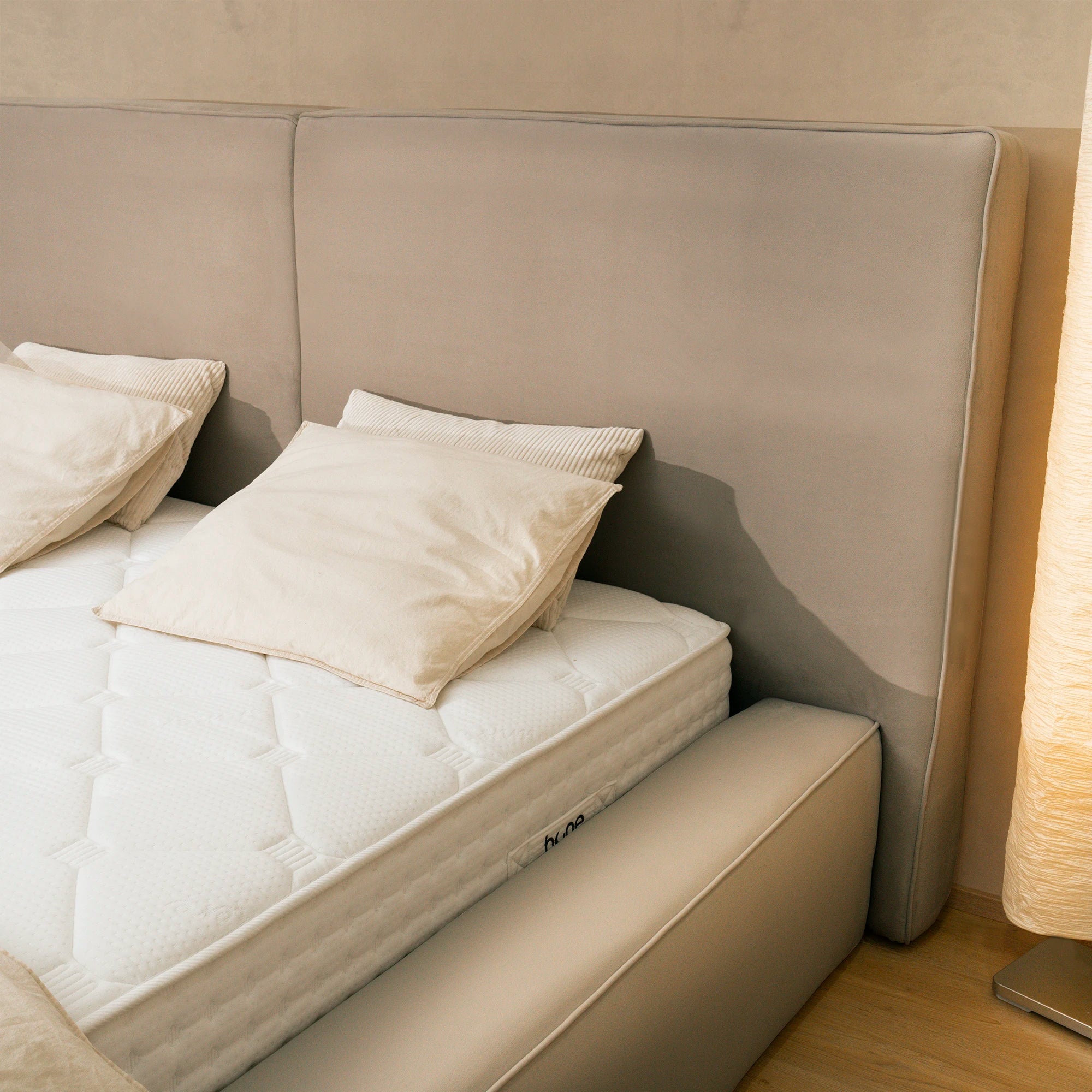 Olbia steht für Klarheit und Komfort in perfekter Balance. Das hohe, zweigeteilte Kopfteil ist weich gepolstert und bietet dir optimalen Halt, ob beim Lesen, Frühstücken im Bett oder einfach Entspannen. Der glatte, durchgehende Rahmen verzichtet auf sichtbare Nähte oder Unterbrechungen – so entsteht eine ruhige, aufgeräumte Optik, die lange aktuell bleibt. Dezente Kanten und die schlanke Linienführung verleihen Olbia eine elegante Silhouette, die zu vielen Einrichtungsstilen passt. Unter der Liegefläche verbirgt sich ein großzügiger Stauraum, der durch einen stabilen Hebemechanismus leicht zugänglich ist – perfekt für Bettwäsche, Decken oder saisonale Kleidung. Olbia verbindet zeitloses Design mit praktischer Funktionalität, die deinen Alltag schöner macht.